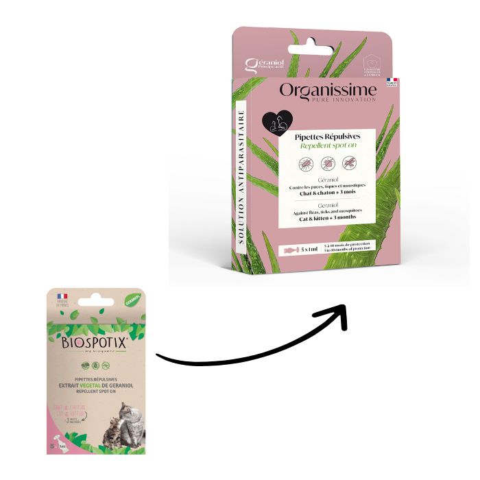 Biospotix is een natuurlijk en een efficiënte oplossing om je kat en zijn omgeving te beschermen tegen ectoparasieten: vlooien, teken, muggen, larven van de herfstmijt en andere schadelijke insecten. De producten zijn samengesteld uit biologische bestanddelen en natuurlijke ingrediënten. Ze hebben geen contra-indicaties en kunnen volkomen veilig op uw huisdieren worden gebruikt. Gegarandeerd zonder parabeen, zonder phenoxylethanol en zonder dierlijke oliën. Dankzij een plantaardige samenstelling op basis van geraniol en natuurlijke etherische oliën, functioneert het product op mechanische wijze door de luchtwegen van de schadelijke insecten te blokkeren, waardoor ze stikken. Dus de teek zal wel bijten maar de longen zullen binnen de 12 uur verkrampen waardoor het insect zal sterven. Biospotix is ook één van de betere middelen die de eieren en larven uitdroogt. De pipet zorgt voor een onmiddellijke en langdurige werking gedurende 4 weken.